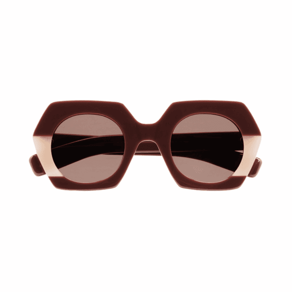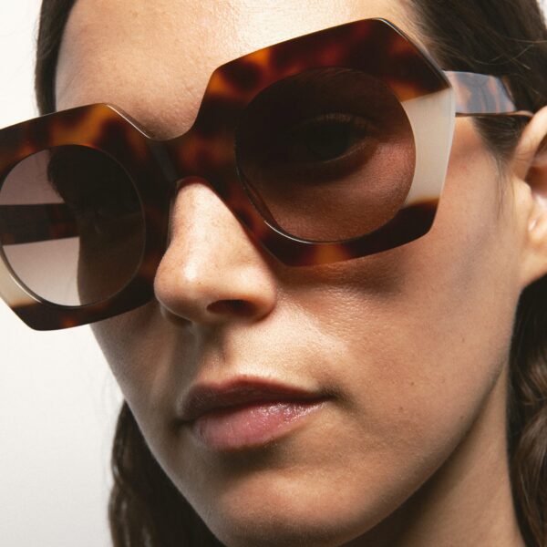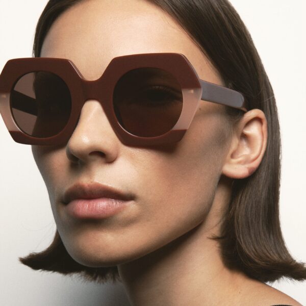Gafa de sol hecha a mano con forma hexagonal. El frontal está hecho en acetato con un laminado translúcido.