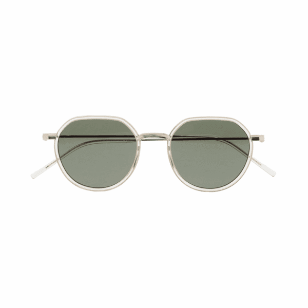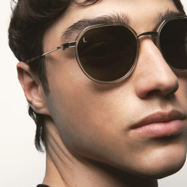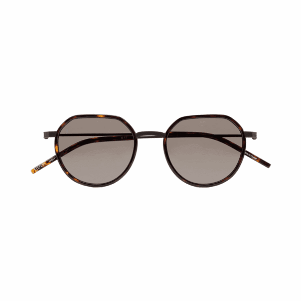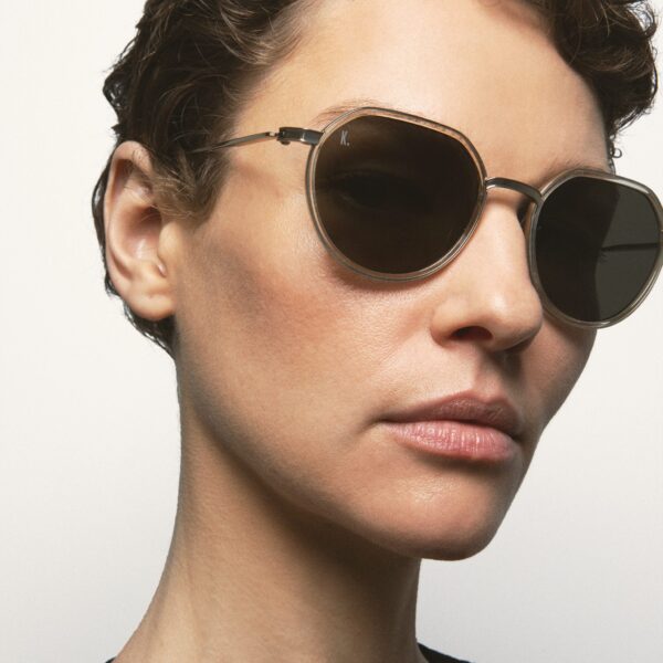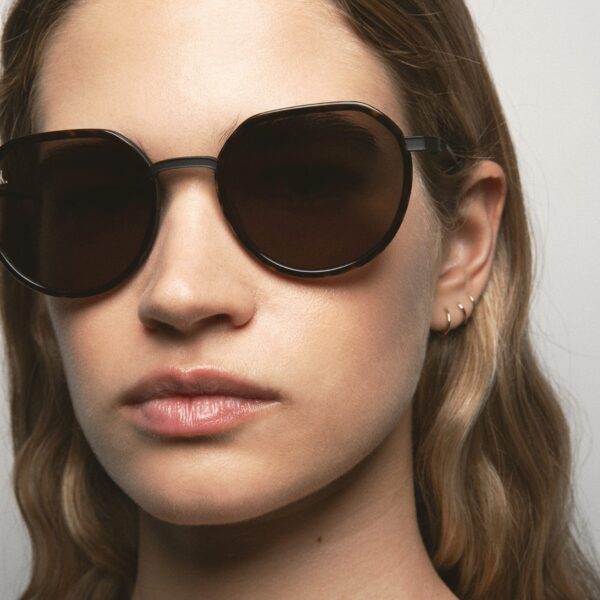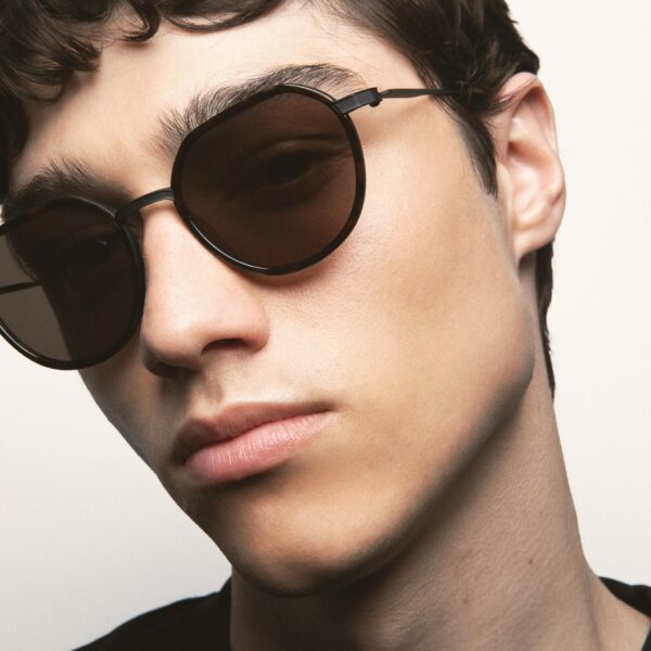 Gafa de sol con forma pantos con la parte superior ligeramente más recta. El frontal está hecho de Titanio con cerquillo de acetato high density. Las varillas y el puente también son de Titanio, con terminales de acetato. Hechas a mano.