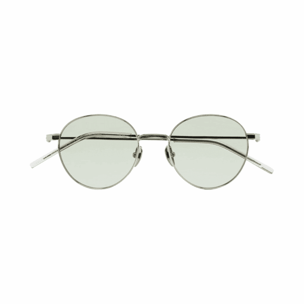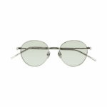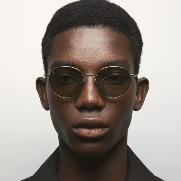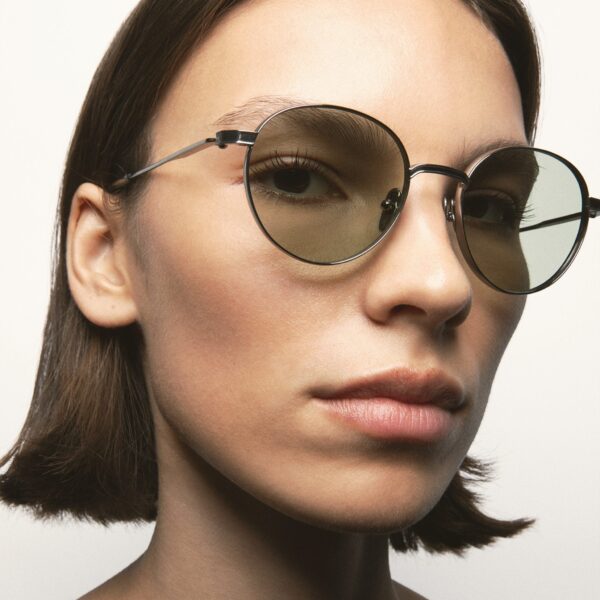 Gafa de sol con forma pantos. Tanto el frontal como las varillas están hechos en Titanio, con terminales de acetato. Hechas a mano.